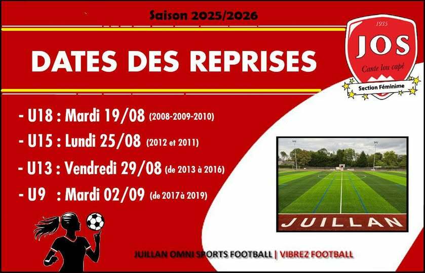 Après la reprise des seniors, voici les dates de reprises de l’école de foot féminine. Si vous souhaitez venir essayer (débutantes acceptées), n’hésitez pas à contacter les responsables de catégories tous diplômés et expérimentés: