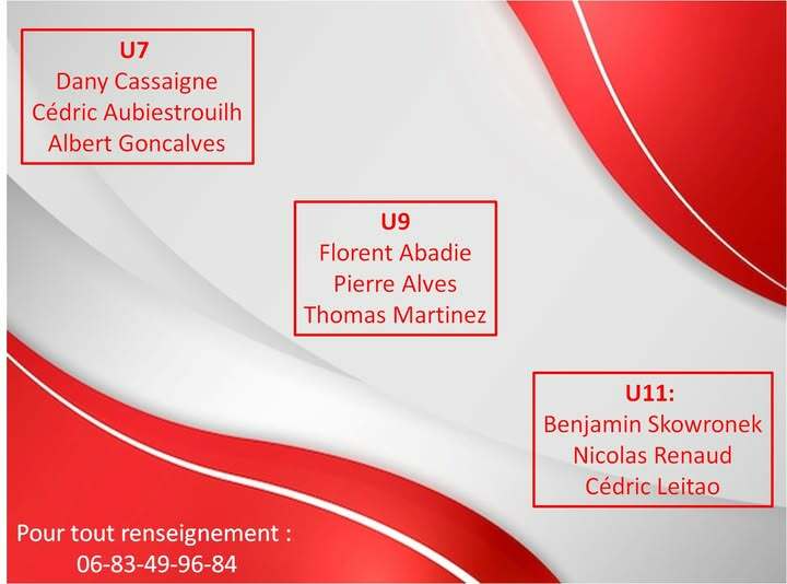 Pour les U7 (nés en 2019 et 2020) et les U9 (nés en 2017 et 2018) : mardi 2 septembre à 17h45. Entrainement également le samedi matin à 10h30